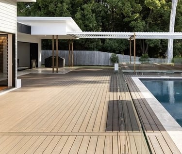 We have chosen to supply the Infinity Luxe range of deck boards as it provides the best "bang for buck" that we know of. It easily matches more well known brands with quality. It has a wide colour range, long warranty and is fully capped. Conveniently, each board has a different colour on each face, making it simple to create designs and feature rows.
